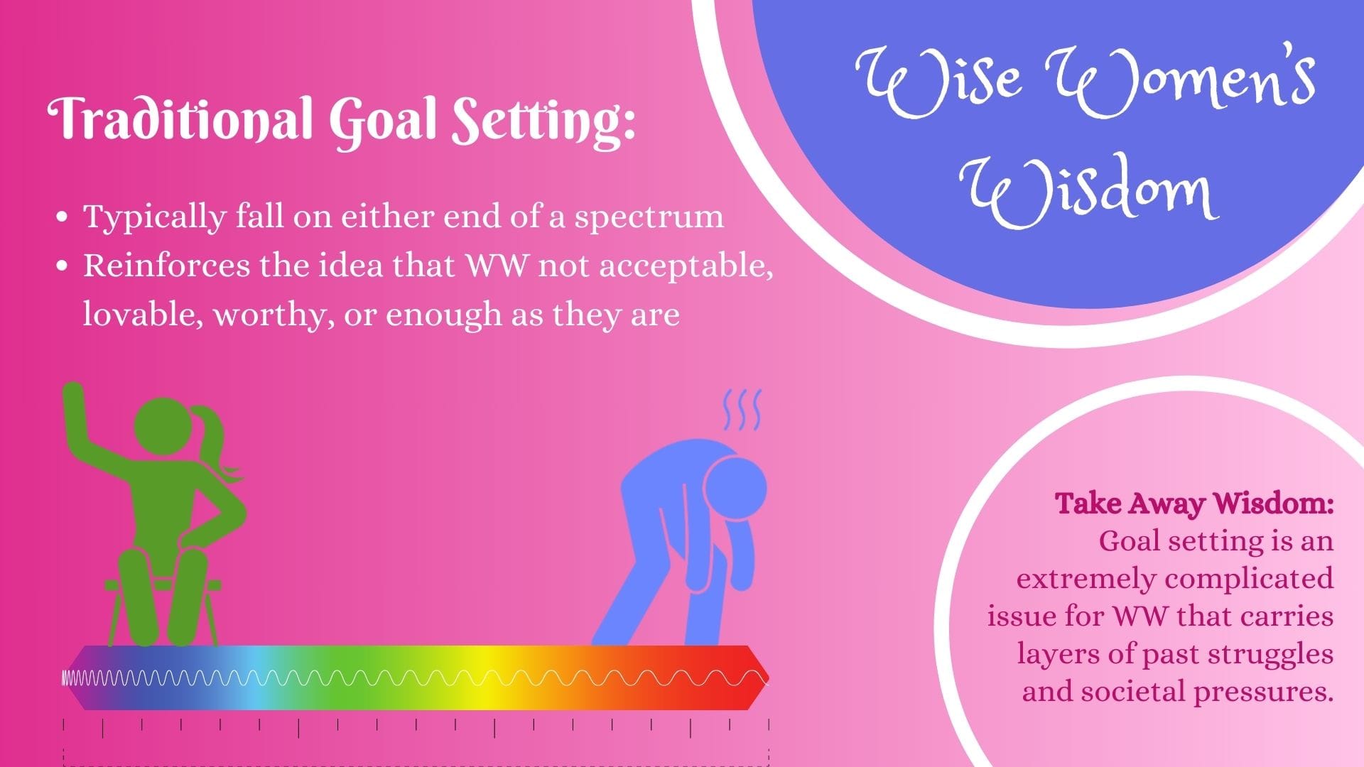 - The other half displayed body postures slumped over with sighs of hopelessness and despair. These Wise Women felt the grief of countless unmet goals, leading them to avoid goal setting altogether. These are often the Wise Women who benefit from learning to set goals in a way that fosters success, increasing awareness of their capabilities, and practicing embodying their unconditional self-worth.