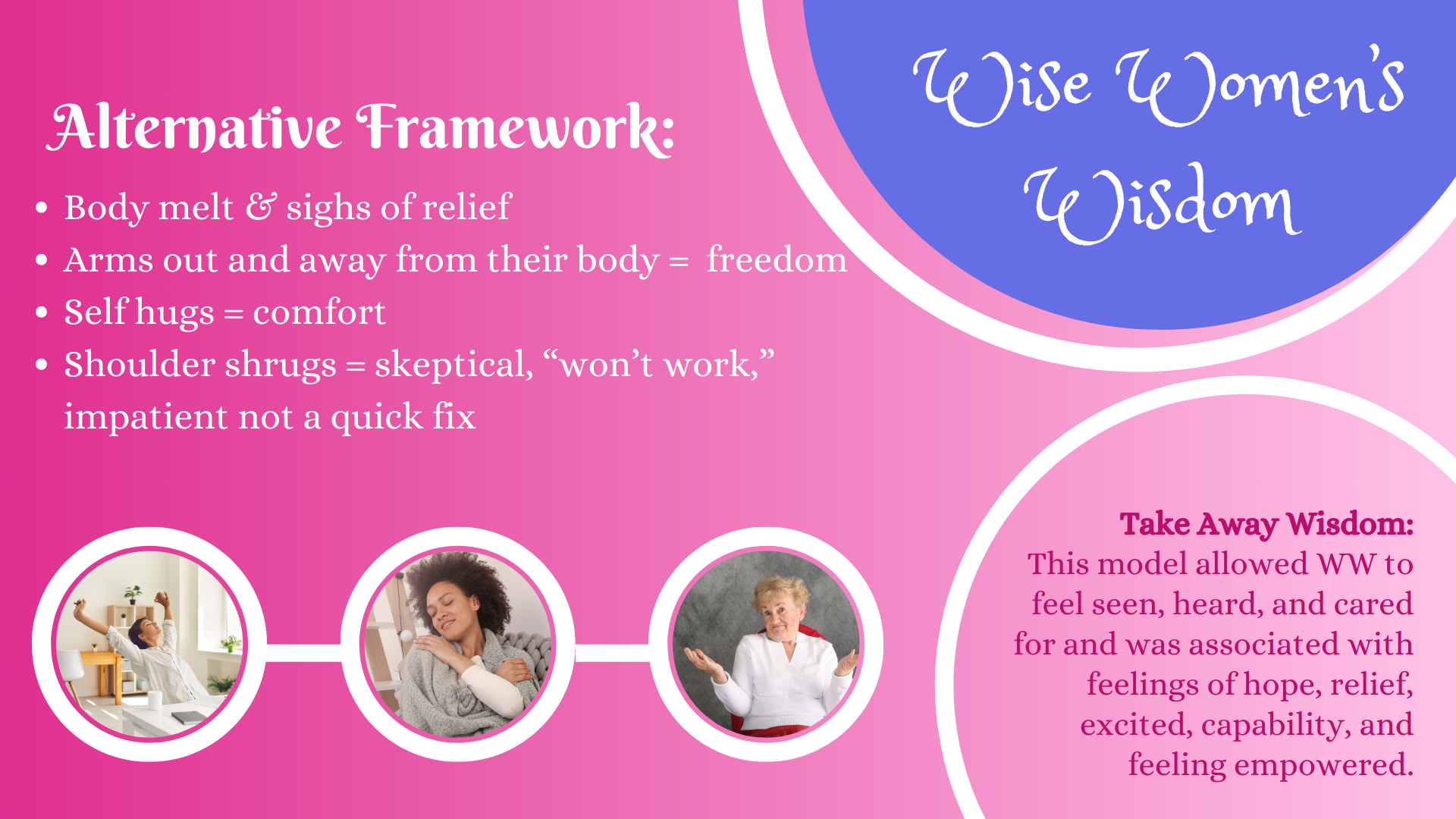 - Many Wise Women lift their arms out and away from their bodies in a sign of freedom, while others allow themselves to melt into their chairs. Most make sounds, like sighs of relief. This model often helps Wise Women feel seen, heard, and cared for, and is associated with feelings of hope, relief, excitement, capability, and empowerment.